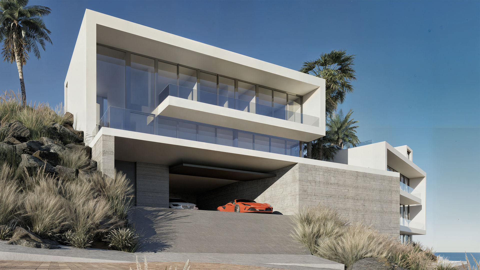 The villas offer a gross floor space of approximately 300m2, distributed over 3 levels nestled in the cliff using concrete bases. On the ground floor the vast space is composed of a living area, a kitchen and a dinning room, all of which have access to the terrace and the swimming pool. The second floor provides a generous sleeping area, composed of three bedrooms, including a magnificent master bedroom that is equipped with a bathroom and dressing room. All the rooms are complemented with a large balcony with view to the sea. The lower ground floor offers a fitness room, a bathroom and a games room. This floor also includes the laundry room, the technical room, a wine cellar and garage for two cars.